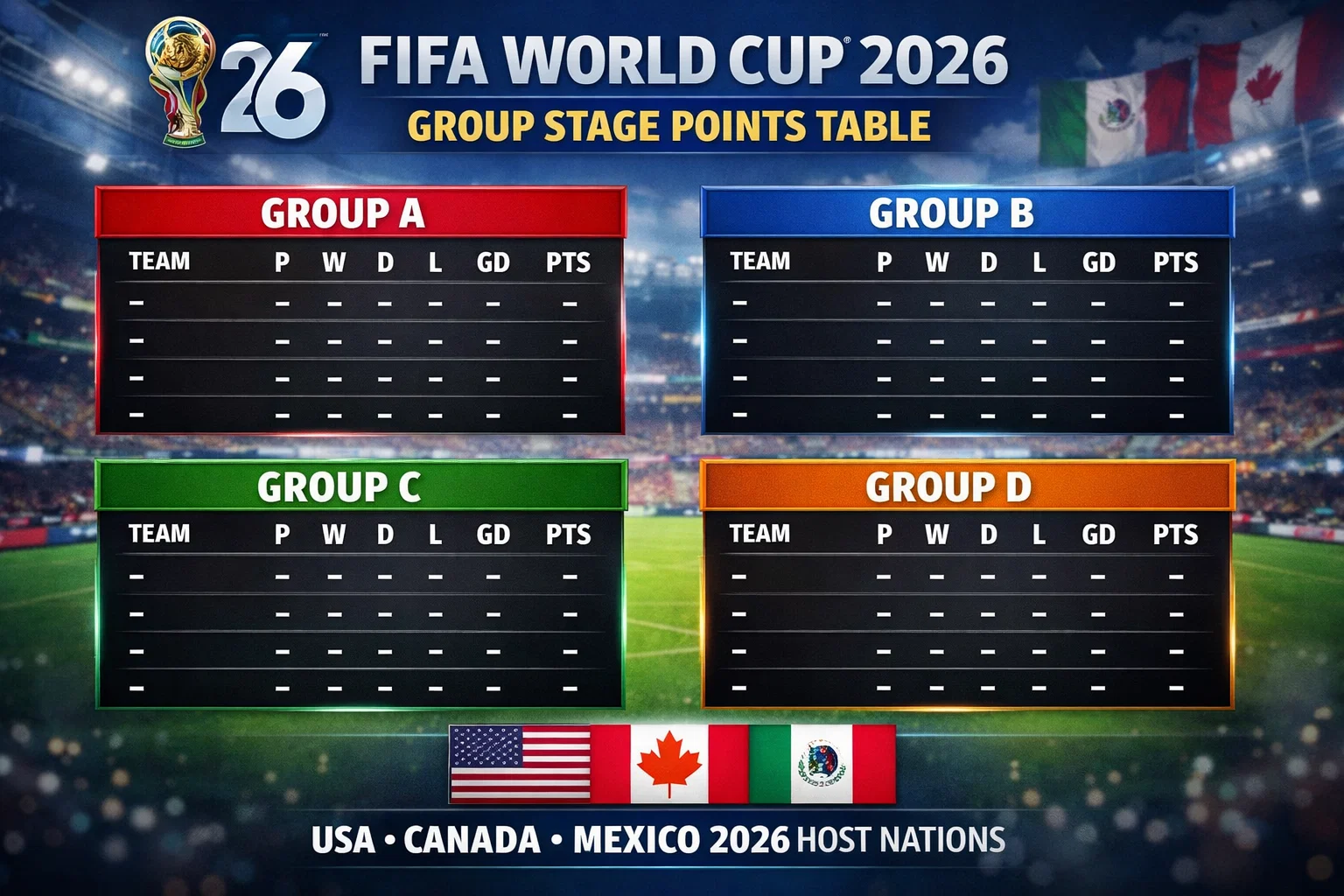 As the 2026 FIFA World Cup has not yet kicked off, all group tables currently show teams with zero matches played and no points on the board. These standings will be updated in real time once the tournament begins, with results, goal differences, and points changing after every match. Fans can expect the tables to evolve rapidly as the group stage progresses, ultimately determining which teams advance to the knockout rounds.