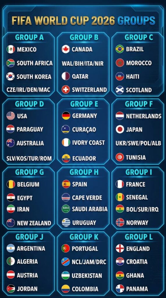 Six teams are still unknown, with four coming from UEFA playoffs and two from FIFA’s intercontinental playoff path. Their final placement will be settled in March 2026.